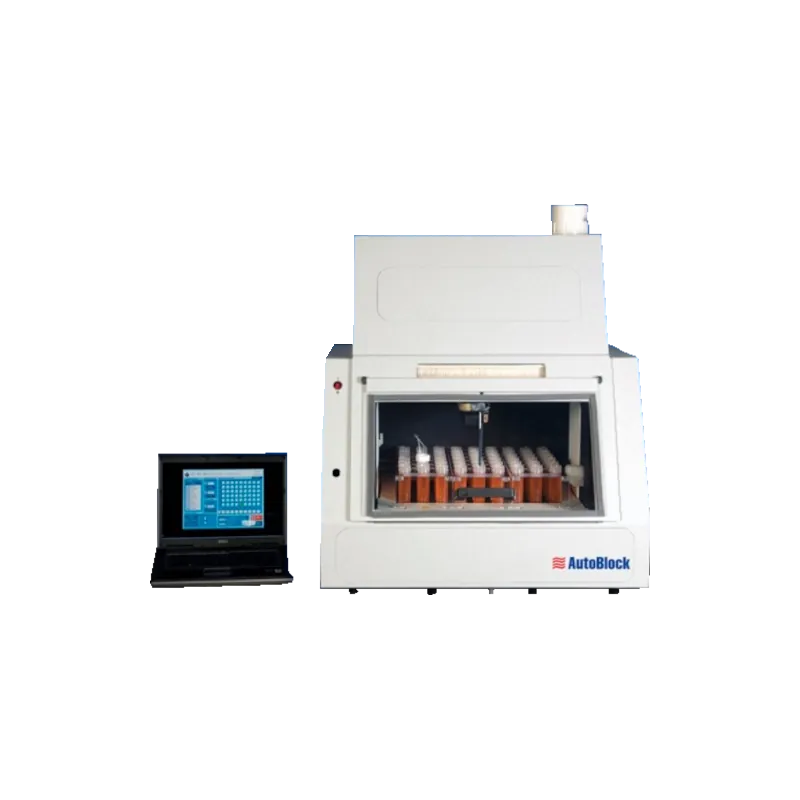 Bloc tout automatique Autoblock™ Plus Version 4 complet. Livré avec 3 portoirs pour tubes 50 ml, 2 portoirs pour bouteilles de réactifs, kits de tubes pour réactifs, système d’extraction, filtre HEPA pour entrée d’air, seconde sonde thermique, aiguille de remplissage et de distribution. Livré sans ordinateur. (1)
