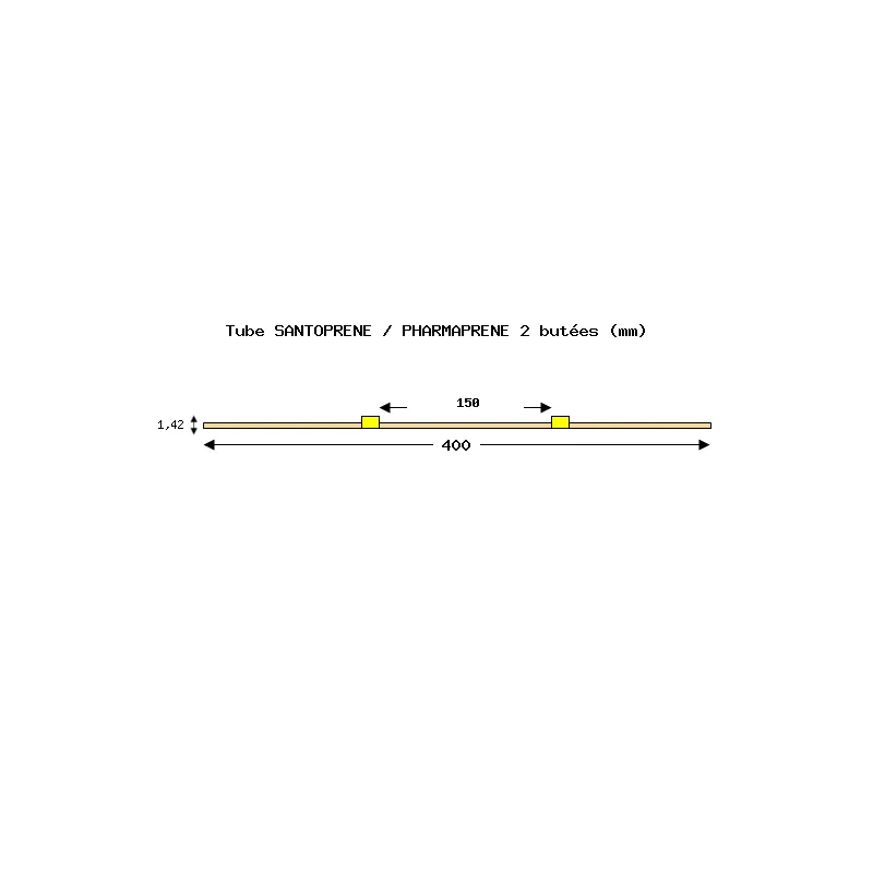 Tube de pompe péristaltique deux butées – Santorpène® / Pharmaprène® – Écartement 150 mm entre butées – Diamètre interne 1,42 mm – jaune/jaune – Longueur 400 mm