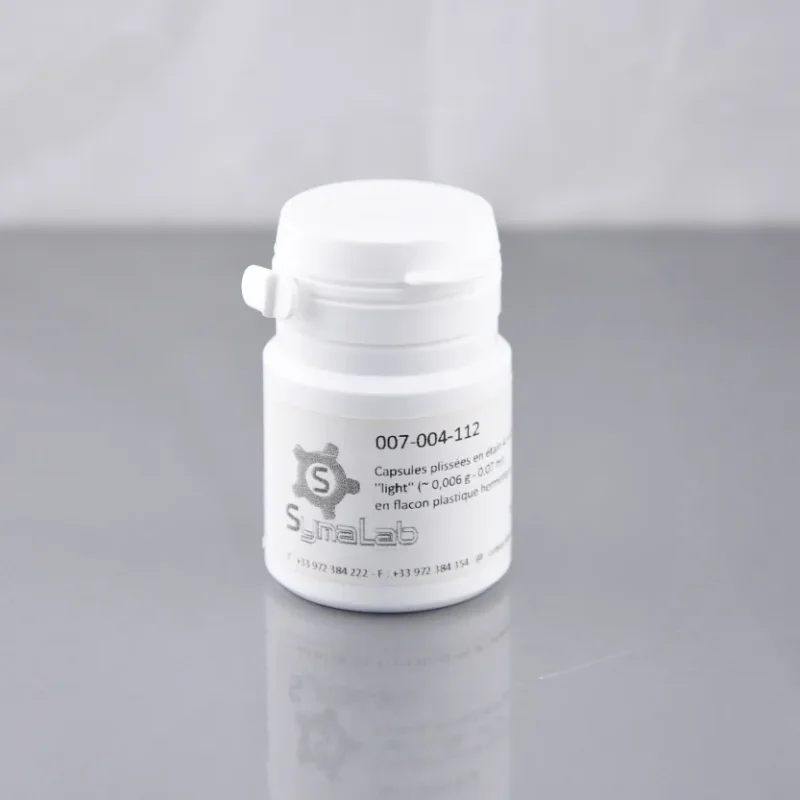 Capsules plissées pour solides en étain 5 x 8 mm « light » (~ 0,0104 g – 0,12 ml) dans boite noire plastique