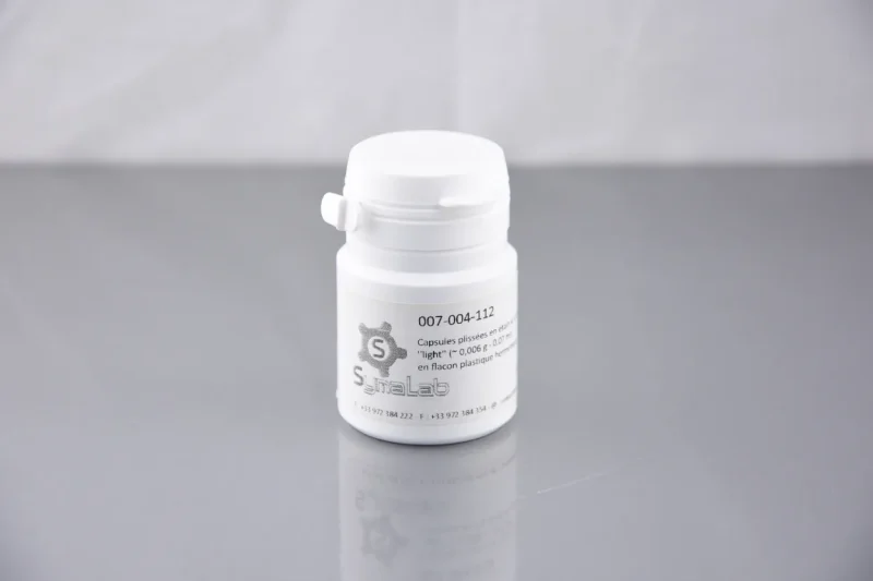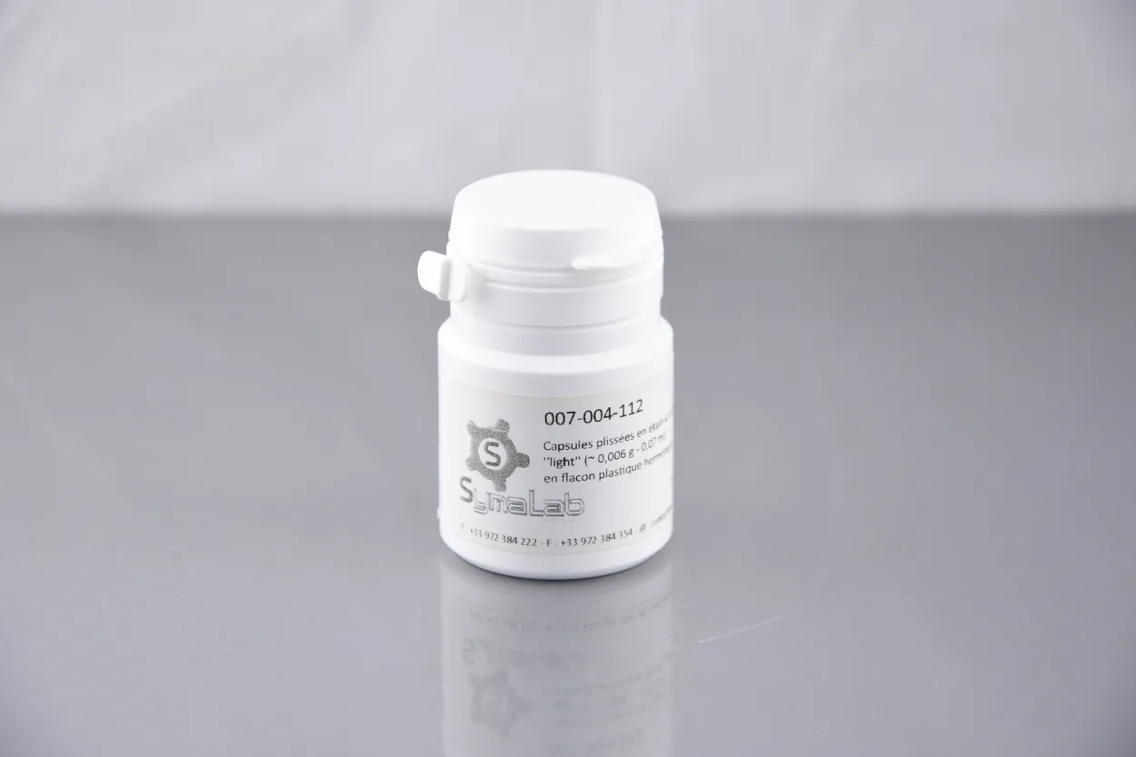 Capsules plissées pour solides en étain 4 x 6 mm « light » (~ 0,006 g – 0,07 ml) en flacon plastique hermétique – réduit l’introduction de la poussière lors de l’ouverture