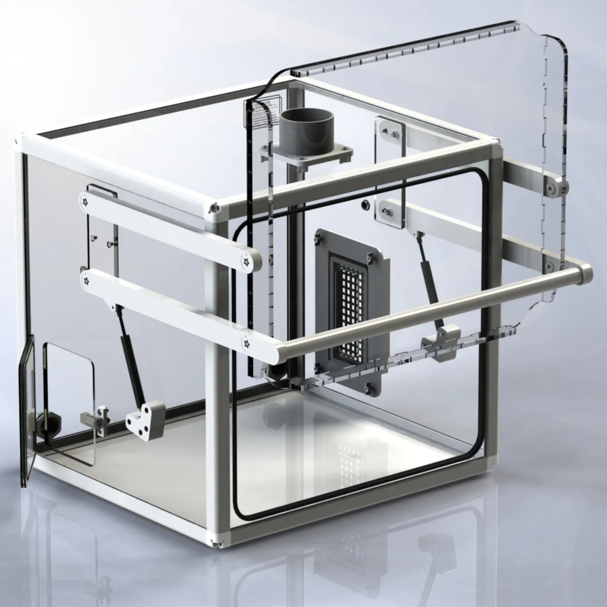 Enceinte de protection PureProtec® – Dimensions (LxPxH mm) 650x580x620 – Environ 43 kg – avec porte basculante-débordante avec raidisseurs transparents horizontaux et verticaux. Entrée filtre latérale. Porte latérale pour accès arrière gauche – Parois et porte latérale en PVC transparent, dessous en PVC blanc. Bras long, poignée et bras court en PVC blanc – Joint corde néoprène intégré aux parois – Configuré pour système d’extraction standard 100 mm – Livré avec filtre latérale HEPA 13 et sortie extraction standard 100 mm – Selon numéro de dessin 0003-005 Ind7 – 012 ind4 – Obsolète remplacée par 015-001-043