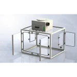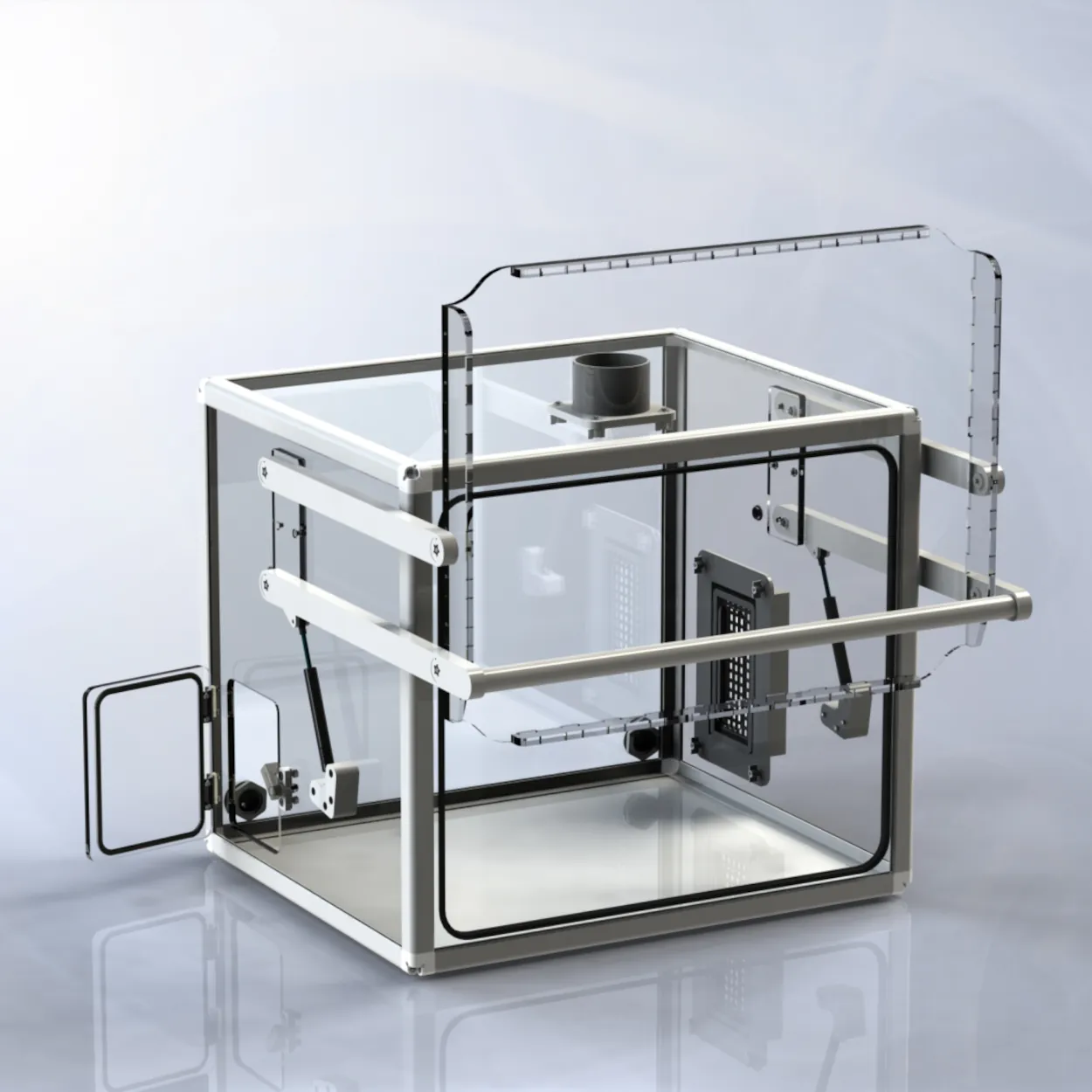 Enceinte de protection PureProtec® – Dimensions (LxPxH mm) 720x600x630 – Environ 47 kg – avec porte basculante-débordante avec raidisseurs transparents horizontaux et verticaux. Entrée filtre latérale. Porte latérale pour accès arrière gauche – Parois et porte latérale en PVC transparent, dessous en PVC blanc. Bras long, poignée et bras court en PVC blanc – Joint corde néoprène intégré aux parois – Configuré pour système d’extraction standard 100 mm – Livré avec filtre latérale HEPA 13 – Selon numéro de dessin 0003-005 Ind7 – 013 ind3 (1)