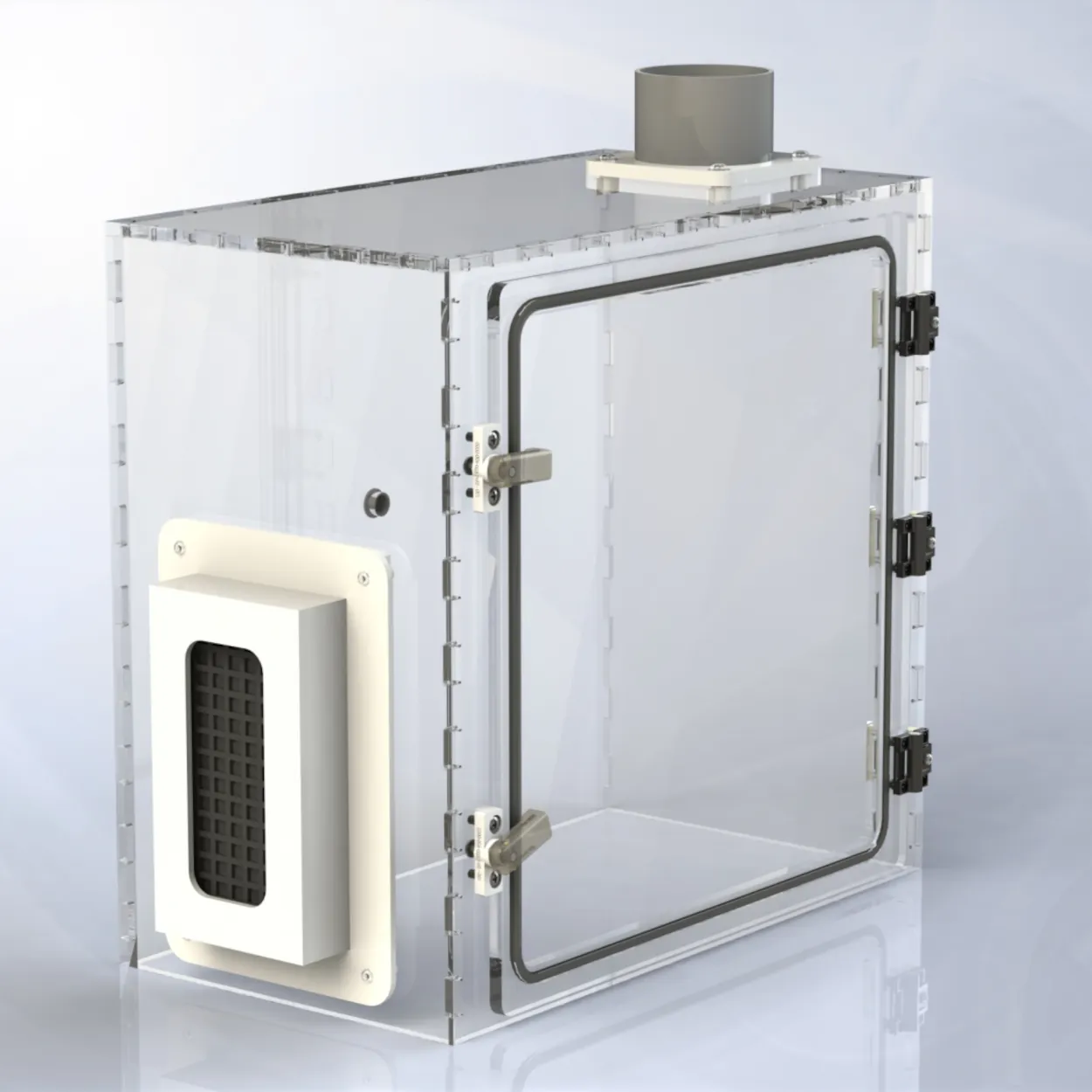 Enceinte de protection pour passeur ESI SC-DX2 incluant un filtre HEPA 13 en entrée d’air, une sortie 100 mm standard et un septum passe tuyau sur la face arrière. Ouverture de la porte mono-vantail tirant droit. Selon dessins 0003-016-001 ind1
