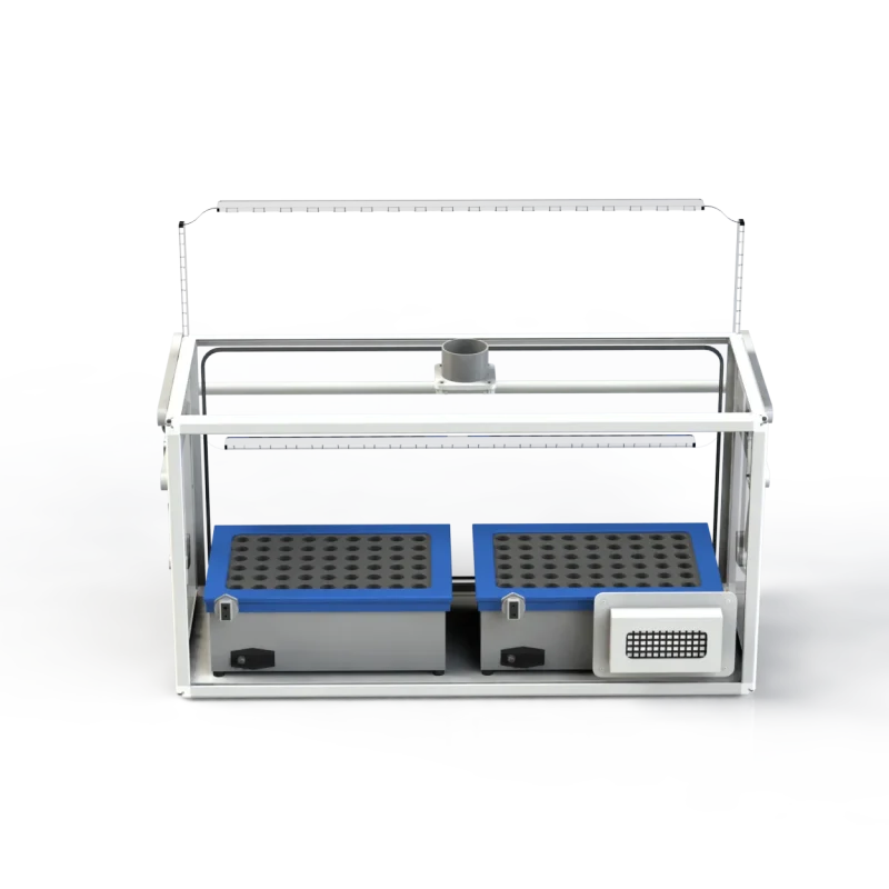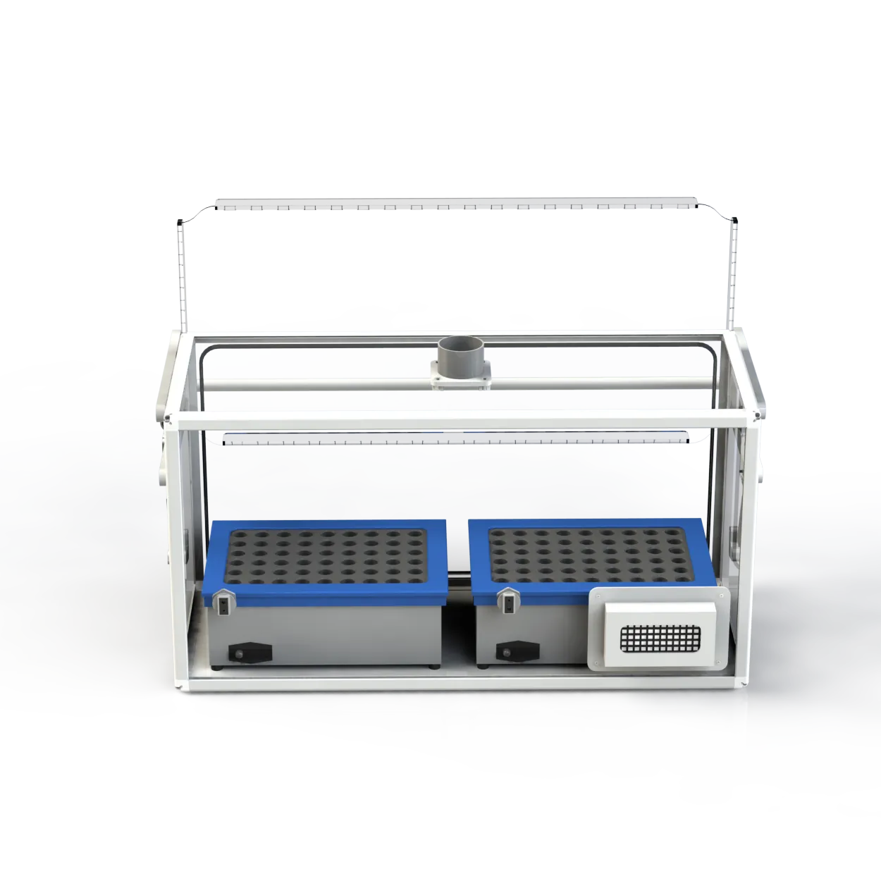 Enceinte pour 2 Hotblock™ – Enceinte de protection PureProtec® conçue pour accueillir deux HotBlock™ 54 positions (rectangulaires). Dimensions internes (LxPxH mm) : 1200 x 480 x 620. Mode porte : basculante+débordante avec sortie 100 mm. Position du filtre HEPA d’entrée d’air à l’arrière gauche.