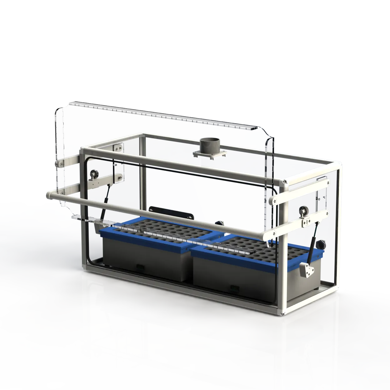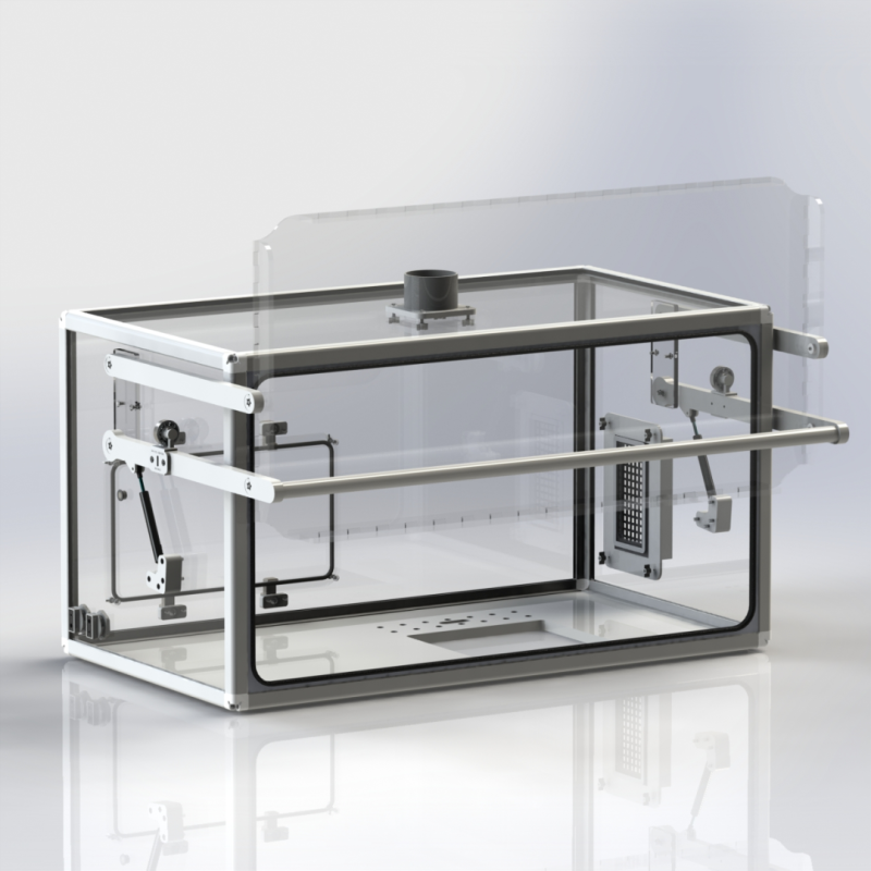 Enceinte de protection PureProtec® – Dimensions (LxPxH mm) 1140x620x620 – Environ 63 kg – Avec porte basculante débordante – Filtration HEPA 13 sur la face droite. Trappe arrière – Parois et trappe arrière en PVC transparent, dessous en PVC blanc. – Dessous avec accès vers un évier et évents de ventilations – Configuré pour système d’extraction simple 100 mm – Selon numéro de dessin 0003-005 Ind7 – 023 ind2