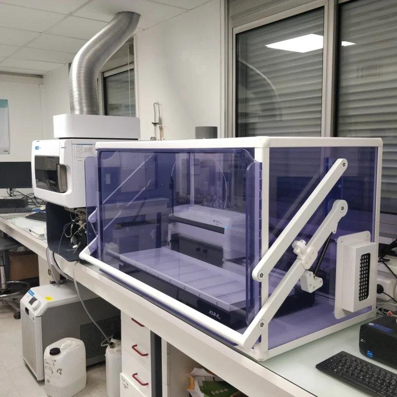 Enceinte de protection pour passeur grande capacité – conçu pour accueillir un passeur Teledyne Cetac XLR 860 – avec porte basculante-débordante avec raidisseurs transparents horizontaux et verticaux. Entrée filtre latérale. Porte latérale pour accès arrière gauche – Parois et porte latérale en PVC transparent, dessous en PVC blanc. Bras long, poignée et bras court en PVC blanc – Joint corde néoprène intégré aux parois – Configuré pour système d’extraction standard 100 mm – Livré avec filtre latérale HEPA 13 et sortie extraction standard 100 mm