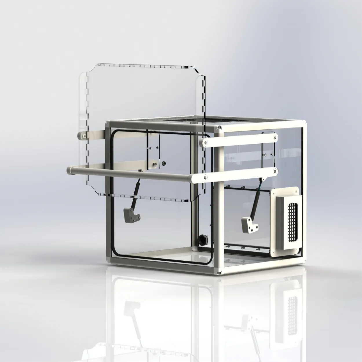 Enceinte de protection PureProtec® – Dimensions (LxPxH mm) 650x580x620 – Environ 43 kg – avec porte basculante débordante. Trappe arrière – Parois et trappe arrière en PVC transparent, dessous en PVC blanc. – Configuré pour système d’extraction ventilé + filtré 100 mm (015-010-001 non fournit) – Selon numéro de dessin 0003-005 Ind7 – 021 ind1 (1)
