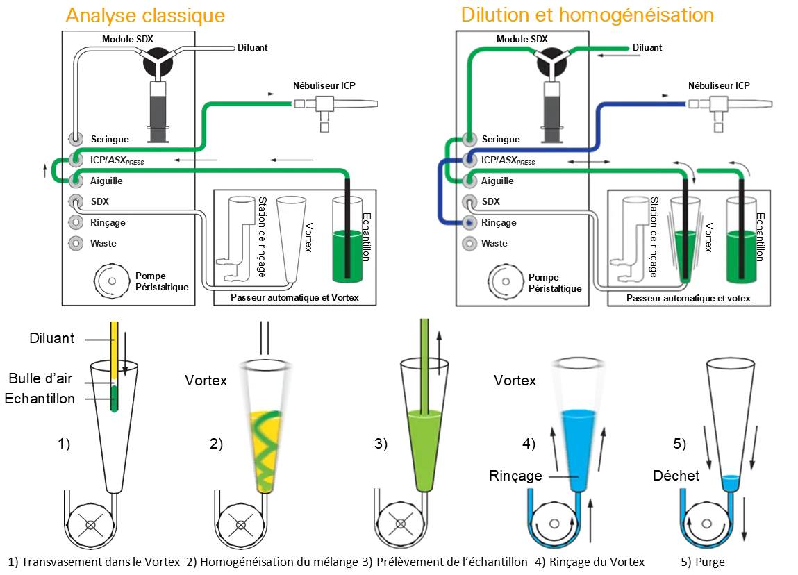 Le système dilue de la même manière que vous le faites à la main : dilution volume-volume, à l'aide d'un pousse-seringue de haute précision, mais il franchit également une étape supplémentaire en mélangeant au vortex la dilution obtenue avant l'introduction de l'échantillon dans l'ICP et l'ICP-MS.
