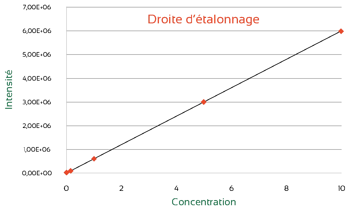 Ci-dessus, vous trouverez les données d’une courbe d’étalonnage réalisée en 5 points. Les solutions ont été réalisées à partir d’une solution mère à 100 ppm diluée de 1/10 jusqu’à 1/2000.